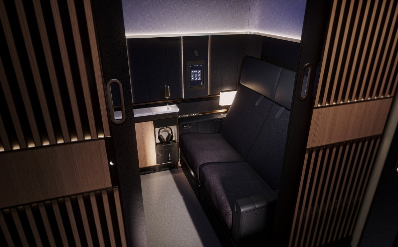 各スイートは、天井までの高い壁と施錠可能なドア、大型テーブルとゆったりとした座席、大型スクリーン、ワイヤレスのオーバーイヤーヘッドフォンを備え、最高クラスにふさわしいしつらえ。