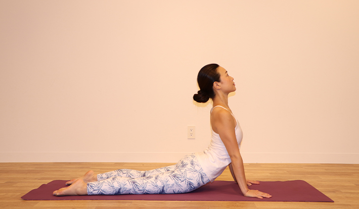 ★ポイント:肩は下げて首を長く伸ばし、胸を大きく開く。 脚の付け根で床を押すようにすると、カラダの前面を気持ちよく伸ばせる。