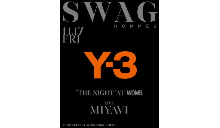 デザイナー山本耀司氏をクリエイティブ・ディレクターに迎え、Spring Summer 2003 コレクションよりスタートしたアディダスのブランド「Y-3」が、ハイエンドスタイルマガジン「SWAG HOMMES」とクラブパーティ「THE NIGHT」を開催する。
