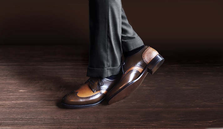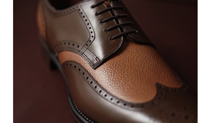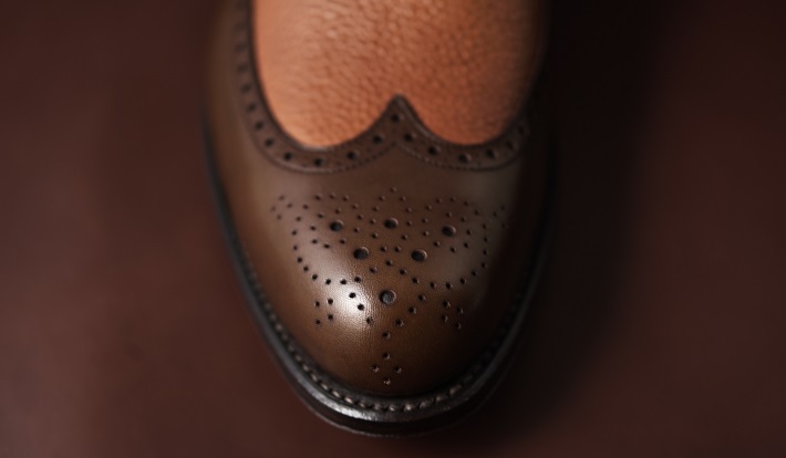 一方ダークブラウンのスムースレザーにはメダリオンやパーフォレーションが施され、ワイルドさとエレガントさが同居する特別な一足に仕上がっている。