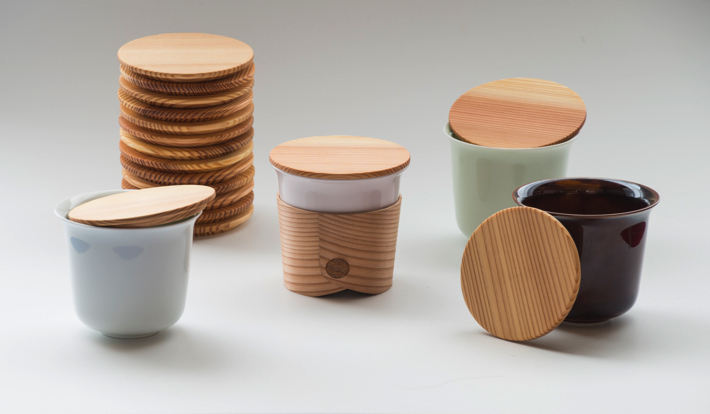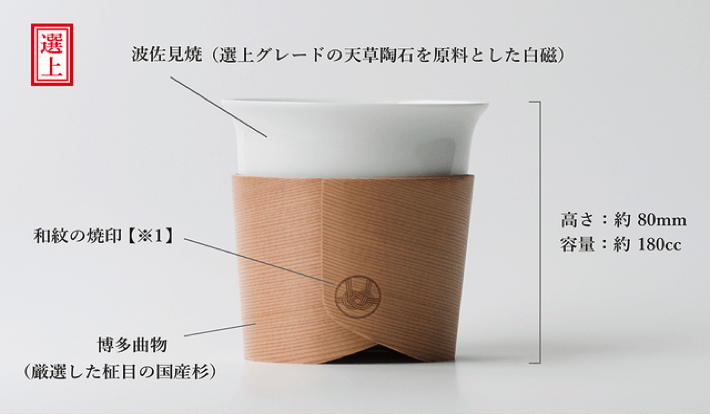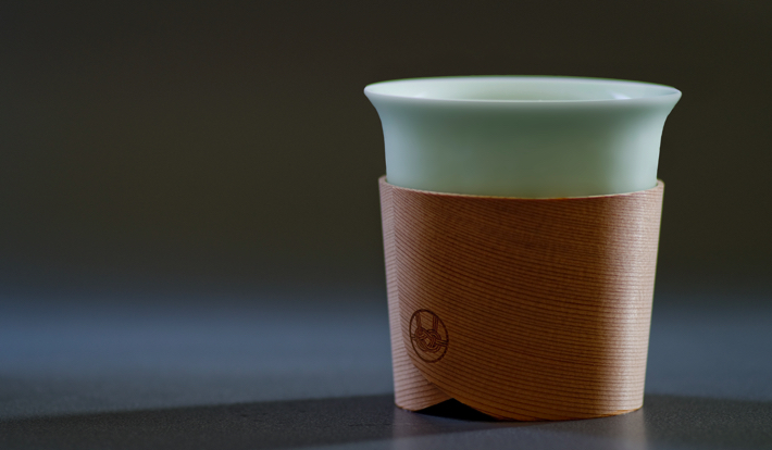 Haori Cupは、長崎県の波佐見焼と福岡県の博多曲物の2つの伝統工芸を組み合わせたフリーカップで、それぞれ異なる2 つの伝統工芸の特徴や機能を活かした工芸品。磁器のカップと曲物のスリーブのセット。磁器のうつわが曲物の羽織ものを着ているように見える佇まい、つまり「見立て」から生まれたデザインだ。