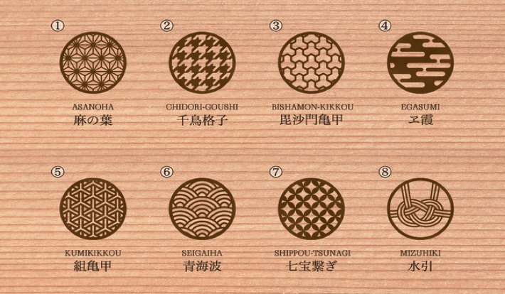 焼印は、8種類から選択可能。またオリジナルロゴや家紋など、好きなデザインの焼印を入れることもできる。