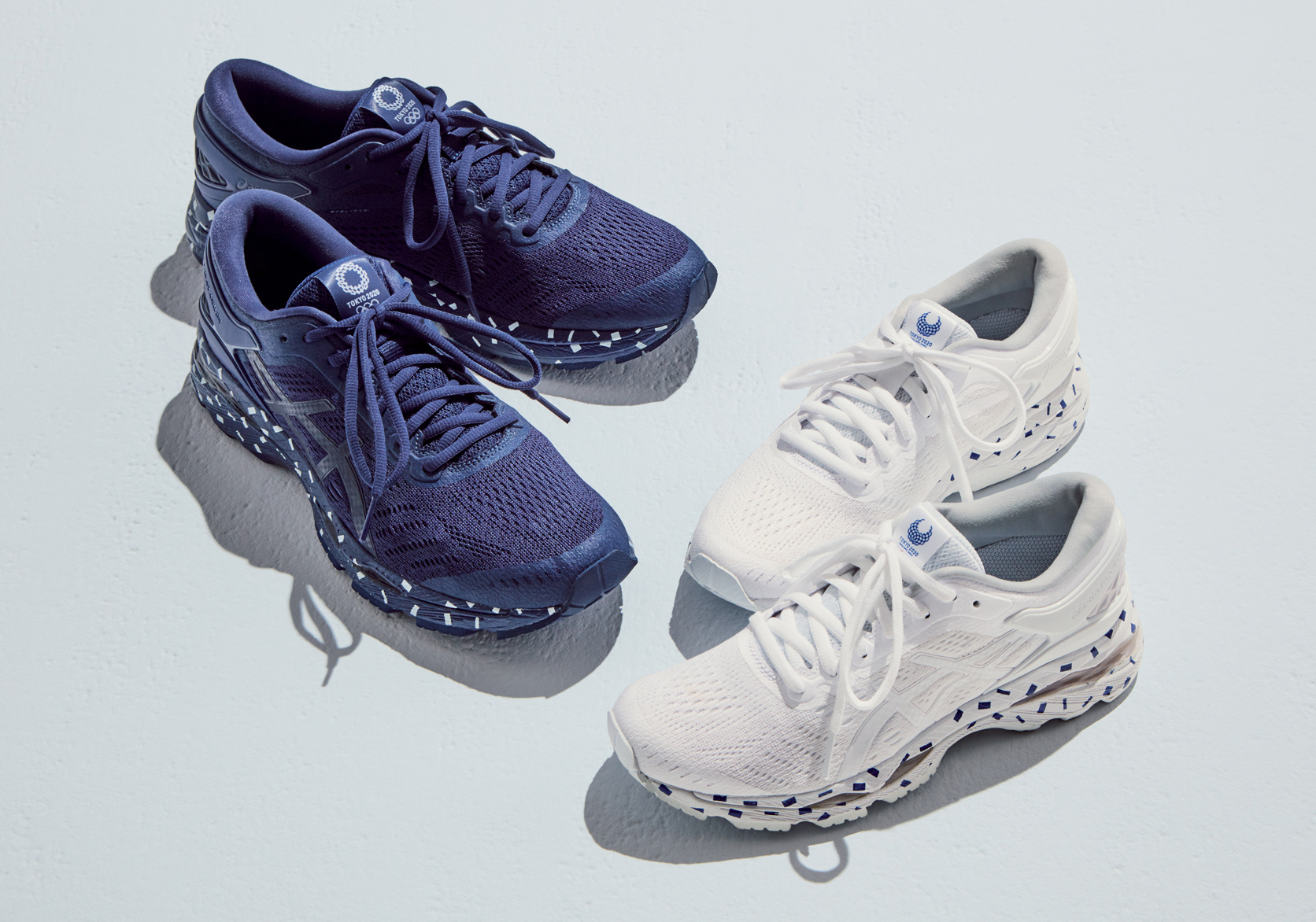 シューズはクッション性や安定性を重視した当社を代表する高機能ランニングシューズ「GEL-KAYANO24(ゲルカヤノ24)」をベースにしており、ミッドソール(甲被と靴底の間の中間クッション材)のサイドや中敷きに細かい紙ふぶきをイメージしたプリントをあしらった、特別仕様。