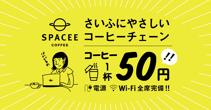 スペイシーコーヒーは、米カリフォルニアのスペシャリティコーヒーを利用しているにもかかわらず、最大で1時間、1杯50円からスペシャリティコーヒーが楽しめる新しいカフェ。さらに、全店舗に電源、Wi-Fiを備え付けているため、作業をする際にも、充電切れやネット環境の心配をする必要がない。待ち合わせや買い物の休憩、営業周りの空き時間など作業する時にも最適だ。