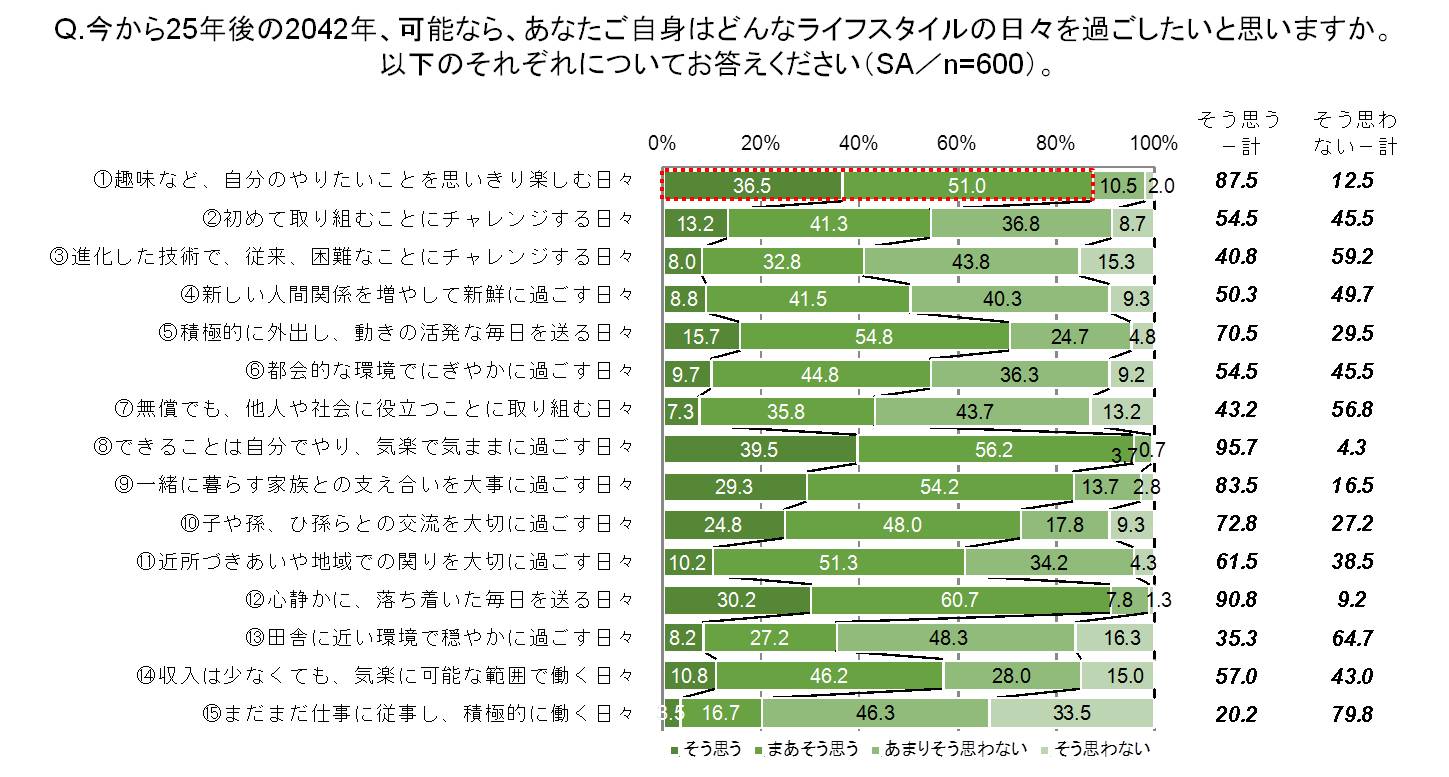 25年後の2042年、どのようなライフスタイルを送っていたいかという質問に対し、約9割(87.5%)が「趣味など、 自分のやりたいことを思いきり楽しむ」と回答。アクティブなライフスタイルを望む人が多いことが分かる。
