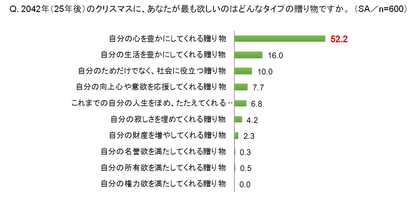 また、2042年のクリスマスにどんなプレゼントが欲しいかという質問に対しては、「自分の心を豊にしてくれる贈り物」と全体の過半数(52.2%)が答えた。団塊世代以上の生活者は、ジャックスがブランドメッセージにも込められている「心の豊かさ」について重視していることが伺える。
