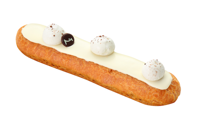 エクレール バニーユは、外側はカリッ、内側はモチッとしたラ・メゾン・デュ・ショコラの特徴的なシュー生地の中に、カカオニブで香りづけしたホワイトチョコレートベースのバニラクリームがたっぷり詰まったエクレール。