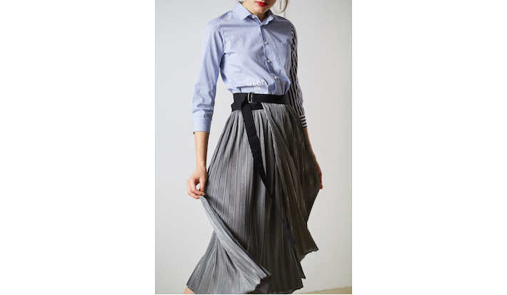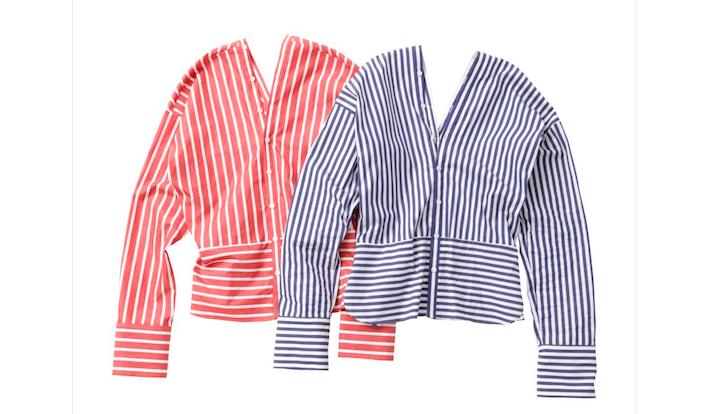 ブランド設立当初から作り続けている「大人と子どもが共有できる」キッズシャツ型は、大人が着用すると7分丈になるコンパクトなシルエットで、女性らしさを強調。