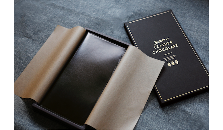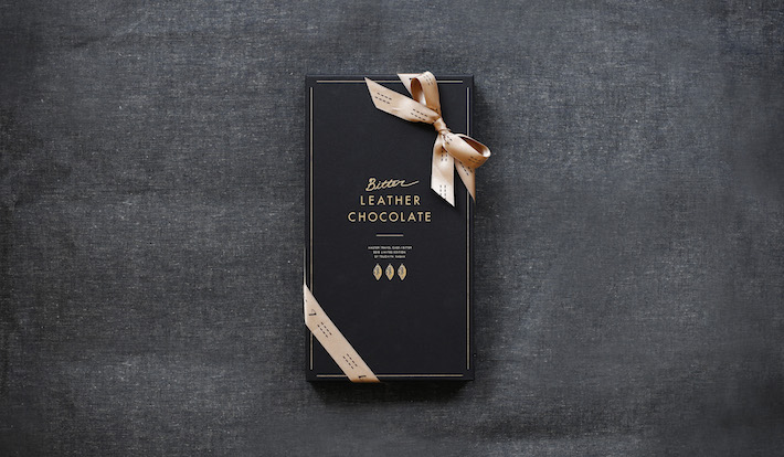 金字の刻印が映えるシックな特製ボックスで、中身は薄紙で包まれ、開くと“革のチョコレートが現れる”という趣向で、心弾む感覚を演出する。