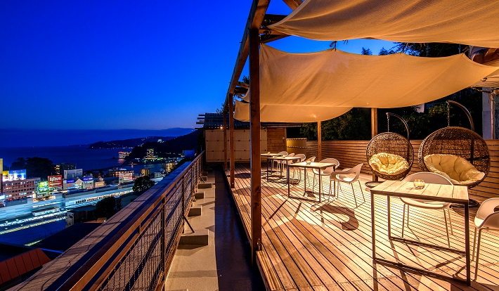 レクトーレ熱海桃山では屋上に露天風呂を用意。オーシャンビューを望むことができる。また、貸切露天風呂も利用が可能だ。「桃山テラス」からは、一年を通して開催される熱海花火大会の絶景を大迫力で楽しめる。
