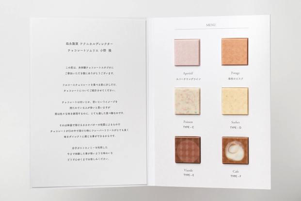 心からフルコースを楽しめるよう、最初のAperitif(食前酒)とPotage(スープ)の2枚は、事前にその味を紹介する。そして新たなチョコレートの世界の入り口までを案内する。