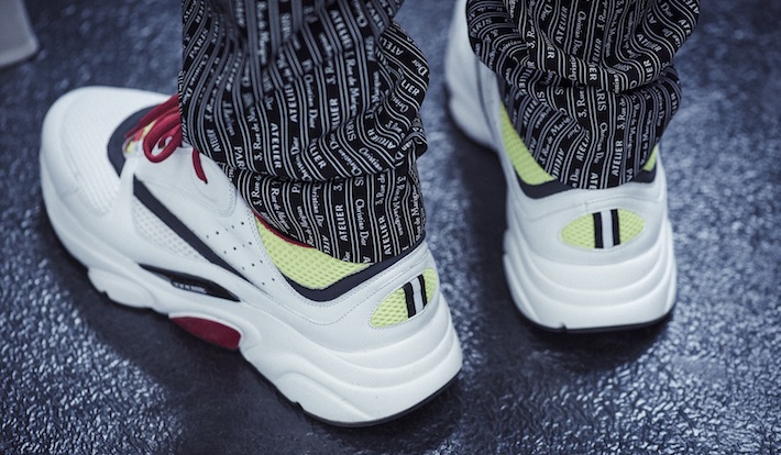 広めのラバーソールがスムースレザーやテクニカルファブリックと融合し、サイドにはブランドを象徴する「DIOR HOMME」のシグネチャーが施されている。