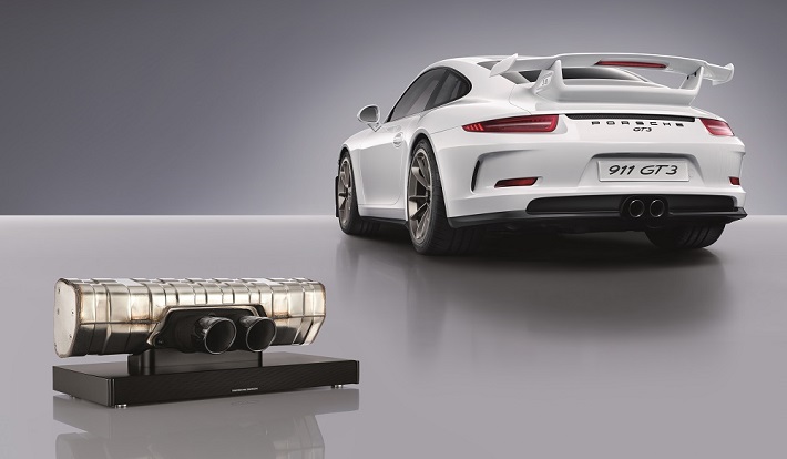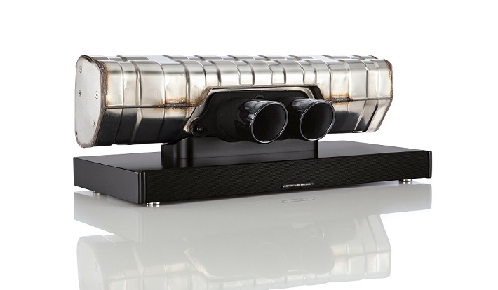無骨な存在感をアピールする「911サウンドバー」は、ポルシェ911GT3に実際に搭載されているメインサイレンサーとエンドパイプをサブウーハー拡張パーツとして使用した2.1バーチャルサラウンドシステム。