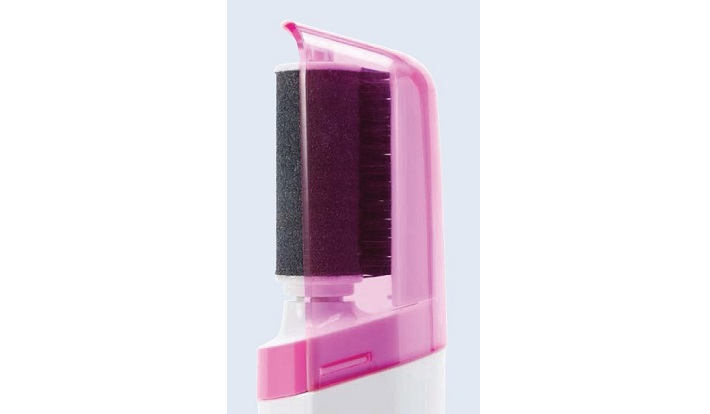 ヤスリ全体を包みこむように設置した角質受けが削った角質をキャッチし、また内部のブラシがヤスリ表面への蓄積を防止。