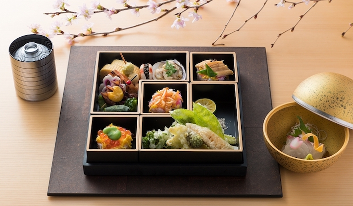 日本の四季の趣きを上質な空間で楽しめる和食レストラン「蔵 – 鉄板焼&寿司」では、鉄板焼カウンターと寿司カウンターそれぞれで、春の旬の味覚を堪能できる「鉄板焼 桜メニュー」と「お花見弁当」を提供する。