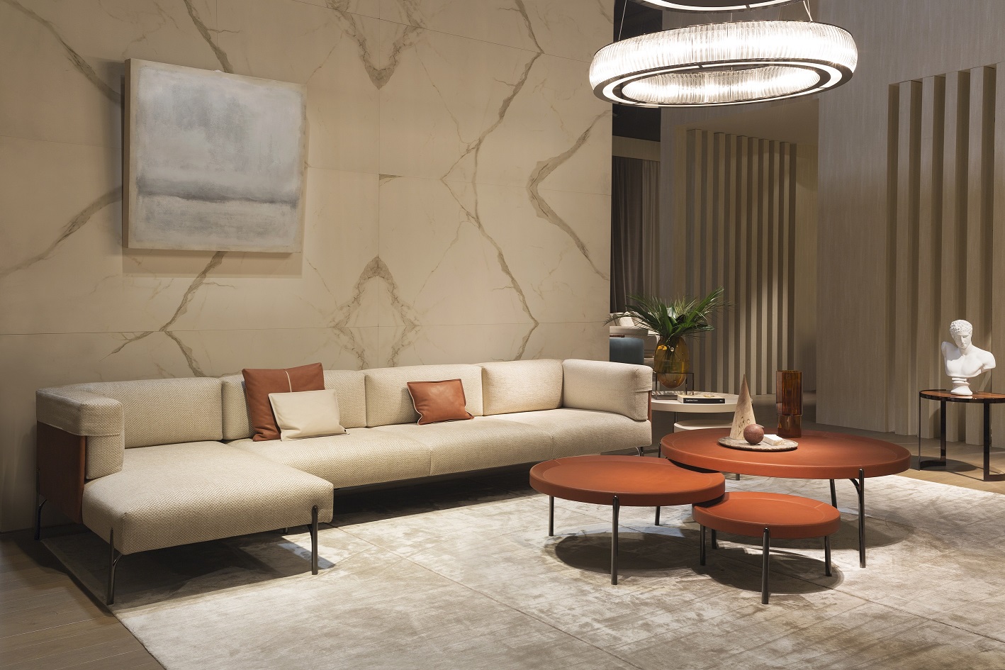 ブロンズやガンメタリック塗装のスチール、グリーン系のベルベット生地、淡いグレー系のレザーなど様々な素材やカラーリングを取り入れた「フェンディ カーサ」の最新のデザインテーマを反映。