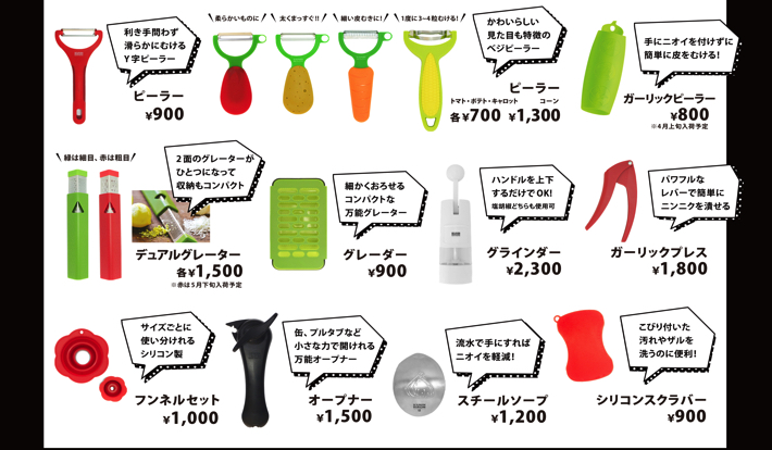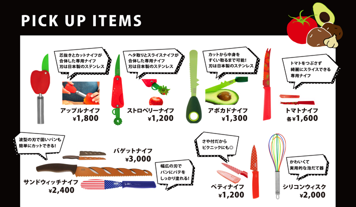 こんなの欲しかった!アップルやストロベリー、アボカドなどの専用食材をカットするそれぞれのナイフを始め、柔らかいもの向け、ほそい皮むきなど食材に合わせたベジピーラー、弱い力で開けられる万能オープナーなど、料理を楽しく手軽にしてくれるキッチングッズが勢ぞろい!野菜の形やアメリカンなデザインなど見た目もかわいいので、バーベキューやピクニックなどアウトドアにもオススメ。