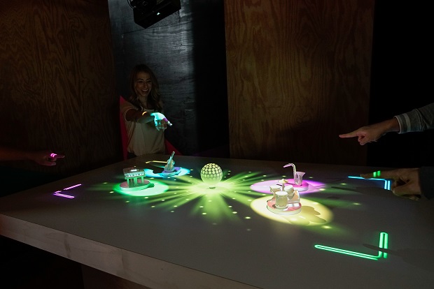 テーブルに触れた指や空中にかざした指を認識することで、インタラクティブな大画面を作り出すことができる。