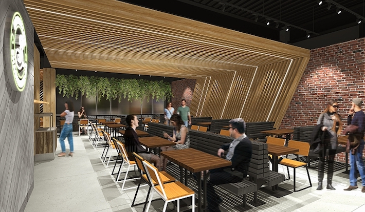 「シェイク シャック テラスモール湘南店」のデザインコンセプトは、海が近くゆったりとした穏やかな時間が流れる湘南辻堂エリアをイメージした「Komorebi」。