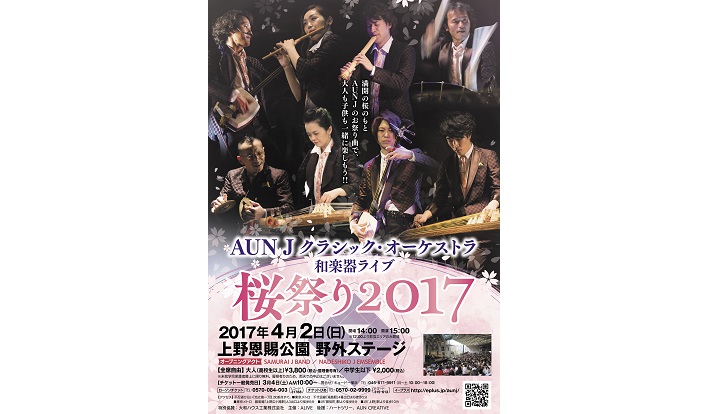 「和楽器を、もっとわかりやすく、かっこよく、シンプルに!」をコンセプトに活動する「AUNJ CLASSIC ORCHETRA(アウンジェイ・クラシック・オーケストラ)」が、「桜祭り 2017」と題し、4月2日(日)に上野恩賜公園 野外ステージで公演を行う。