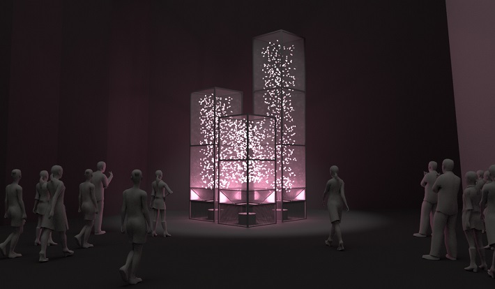 内部には花びらに見立てた紙片が敷き詰められ、送風機と照明をプログラミング制御して風と光をアニメーションさせることにより、まるで花びらが風に吹かれて舞っているかのような自然現象を再現している。