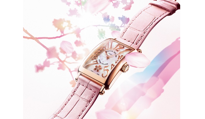 文字盤に桜をあしらった春らしい新作「ロングアイランド サクラ M.O.P」は、神秘的でまろやかな光彩が輝くマザーオブパールを配したエレガントなタイムピース。