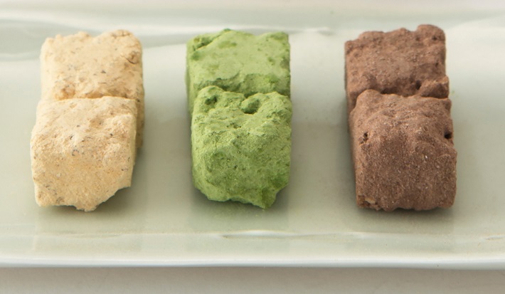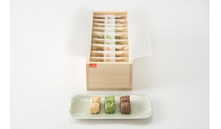 新商品の「いしいし 三芳包み(さんぽうつつみ)」は、ひと口サイズの粟おこしに、きなこ・抹茶・ココアの三種のパウダーをまぶした逸品だ。