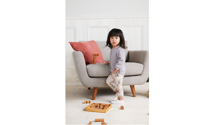 ピンク、グレー、ブルーなど、パステルカラーのソフトな色合いが全体的あしらわれ、トップス、ドレス、レギンス、ジョガーパンツ、ニットを柔らかい素材で展開。