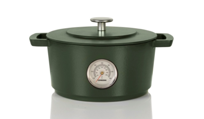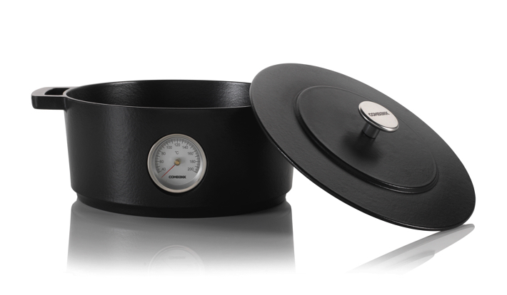 一般的な鋳物鍋に比べ、蓋も含め厚手に作られているので重たいが、これによりとても優れた蓄熱性と均一で調理に理想的な熱回りを実現している。低温での肉のロ ースト、シチューや煮物、パン焼き、炊飯など全ての調理に優れている。錆びないのはもちろんの事、油馴染みが良く、薄い一層のみのマット仕上げの琺瑯加工。蓋の内側にサーキュラーラインと円状に配置された突起により、鍋内で蒸発した水分を循環させ、 旨味を食材全体に行き渡らせる。また、フラットな形状の蓋はベーコンプレス(肉を 焼くときの重し)としても使える。サーモメーター(温度計)は、蓋を開けて中身を確認することなくこと温度管理が重要な調理が出来る。しかも、鍋本体(琺瑯加工を除く)は40年使用可能な高い品質。