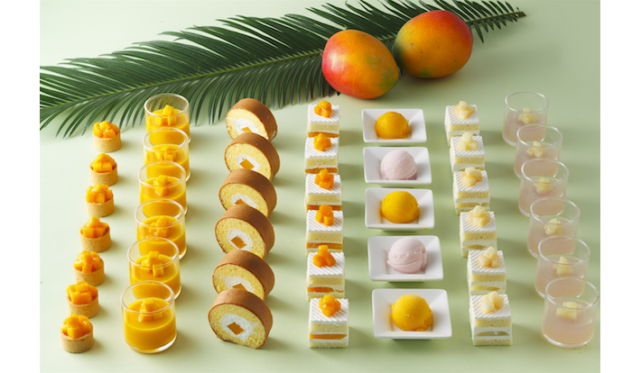 食べ頃を迎えた芳醇な完熟マンゴーとピーチそれぞれ、ショートケーキやロールケーキ、タルトなどの定番から、暑い夏にこそ食べたいムースやジュレ、シャーベット、絶品マンゴーソースで味わうパンケーキやマカロン、ピーチムースなど全15種類のスイーツが楽しめる。