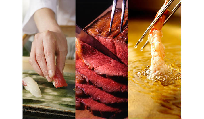 スイーツの他にも、低温でじっくりジューシーに焼き上げるホテル伝統のローストビーフをはじめ、鉄板焼やにぎり寿司、天麩羅(ディナーのみ)など、ライブ感溢れるシェフのクッキングサービスも堪能できるほか、和・洋・中のニューオータニの人気の料理(全25種類)がラインナップ。