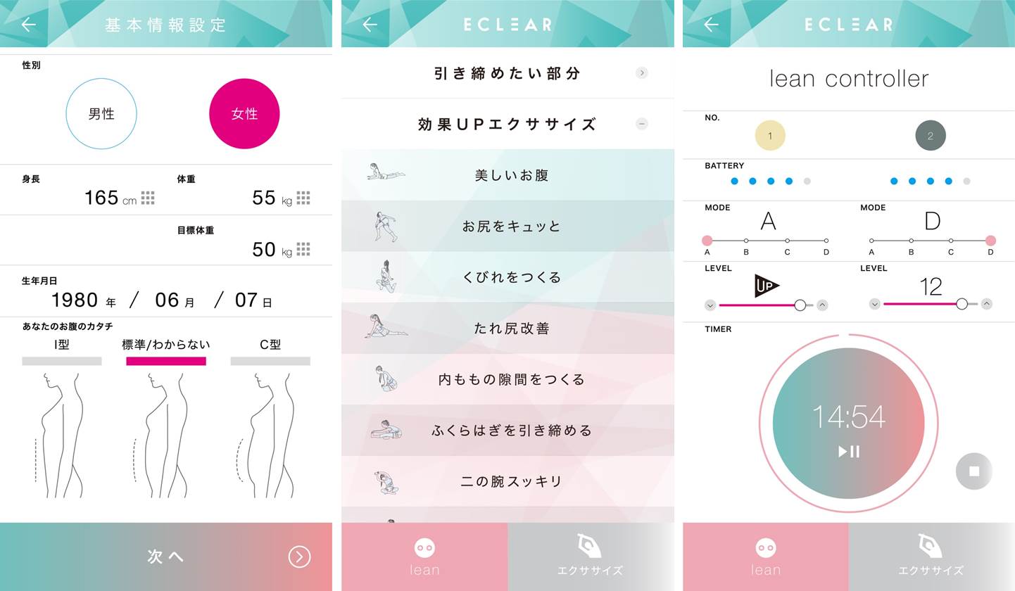 アプリとの連携によって、個人の体型に合わせた、各部位に最適な周波数を自動設定できるEMS※1 機器「エクリア リーンアップ」を、2018 年 6 月に発売を開始した。
