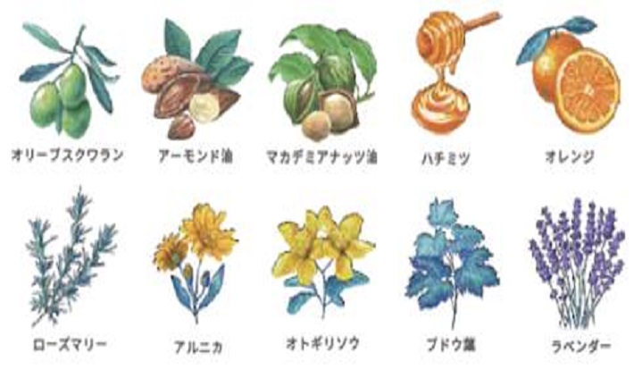 オリーブスクワラン、アーモンド油、マカデミアナッツ油等の7種類のボタニカルエッセンスオイル※1をはじめ、ハチミツ、オレンジ、ローズマリー、アルニカ、ラベンダー等22種類もの天然由来成分を贅沢に配合。