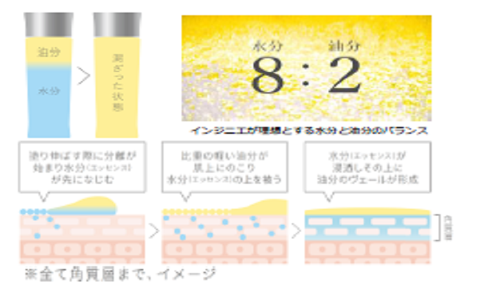 また、水分とオイルのバランス「 8 : 2 」を理想とし、肌本来が求める水分バランスを目指した。効能評価試験済では乾燥による小じわを目立たなくする、乾燥小ジワ対策の効果が認められている。