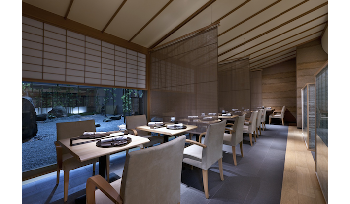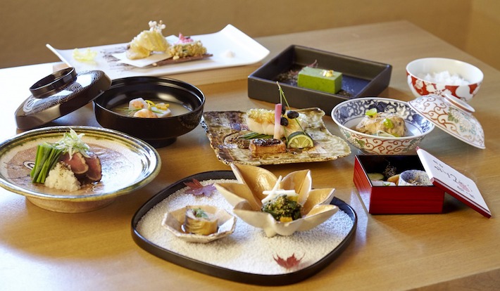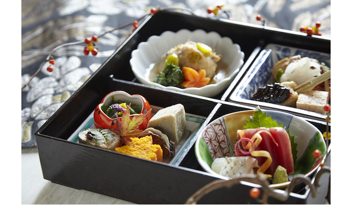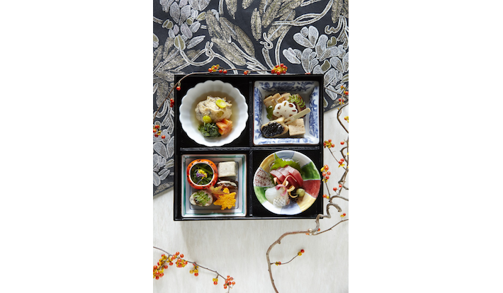 古くから京都に伝わる、ぐじ(甘鯛)の若挟焼きや、真鯛の丹波揚げ、水菓子には西陣織の優雅な染付をイメージしてつくられた宇治抹茶の羽二重など、伝統文化を愉しめる。