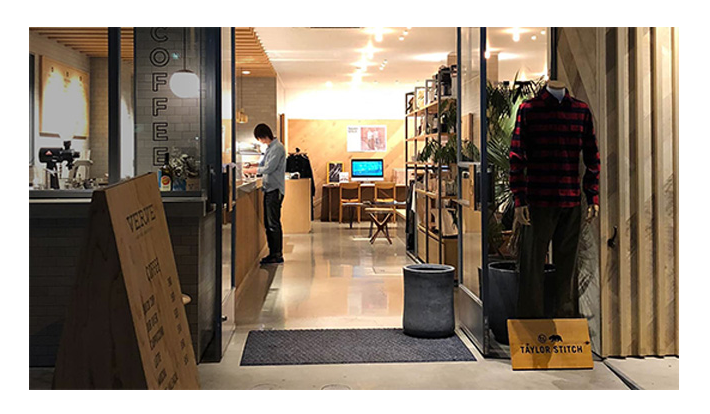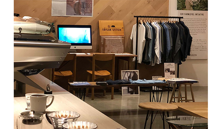 コーヒーの香ばしい匂いが漂う、ウッドを基調としたスタイリッシュな店内の一角に、「テイラー スティッチ」の新作から定番の人気アイテムまでを一堂に展示。