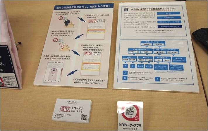 店頭商品にはNFCタグを配しており、タッチすることで情報を転送、店内で気になった商品をNFCタグにかざすだけで商品購入ページに飛ぶことが可能となる。その場で購入しなくても、携帯に検索結果の保存が可能なため、後日自宅などで購入できる。※NFCタグ:交通系ICカードに似た近距離通信規格