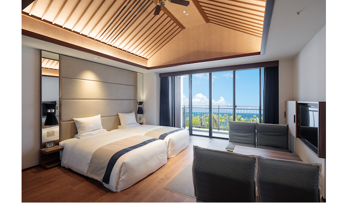 151室の客室は、絶景の石垣ブルーの海と白浜ビーチを望むオーシャンビューや、亜熱帯植物に囲まれたパティオタイプ、子連れでの滞在にぴったりなファミリールームなど全11種がラインナップ。