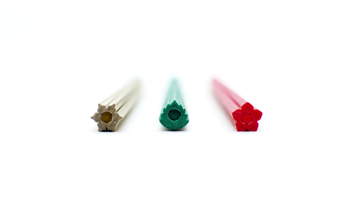通常の花色鉛筆と同様、芯の周りの軸部分には、廃棄古紙を主原料とした環境にやさしい素材を用いることで、独特の柔らかい色と削りやすさを両立。繊細で軽やかな雪の結晶をその断面に表現、結晶の煌きを緑、金、赤と三つの色で表し、軸部分に細かな粒子を混ぜ込むことで、クリスマスを表現している。芯には上質な国産品を採用し、心地良い書き味も魅力。
