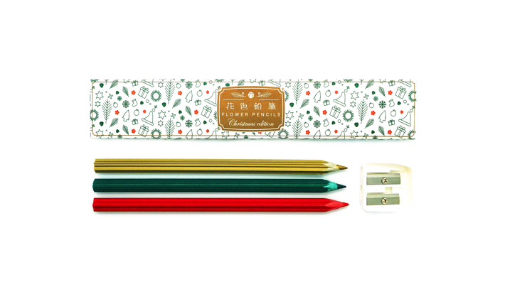 「花色鉛筆 / Christmas edition」は、「ツリー(緑)」、「雪の結晶(金)」に「ポインセチア(赤)」をセットにした、クリスマスムード満点の色鉛筆。