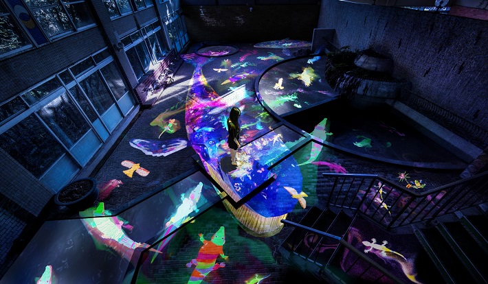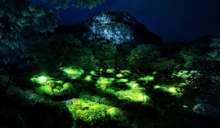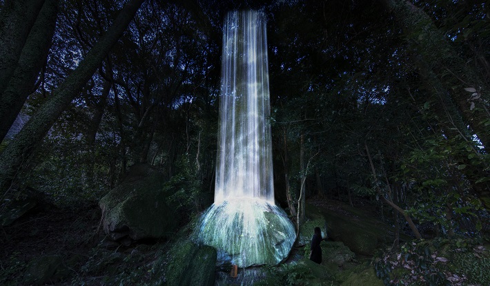 池の水面に蓮の花が咲きわたり、鯉が泳ぐ「小舟と共に踊る鯉によって描かれる水面のドローイングと蓮の花」や、訪れた人々がカエルやトカゲなどの生き物を描くと、現在は廃墟となっている大浴場で動き出す「Graffiti Nature - 廃墟の湯屋に住む生き物たち」、苔の巨岩に8mの滝をプロジェクションした「かみさまの御前なる岩に憑依する滝」など、光が織りなすデジタルアートと、森やツツジ谷などの自然が融合した圧巻の光景が目の前に広がる。