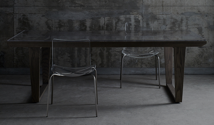 TRANSPARENCY のコレクションでも初となる木材とアクリルの組み合わせのインテリア専用のビッグテーブル。