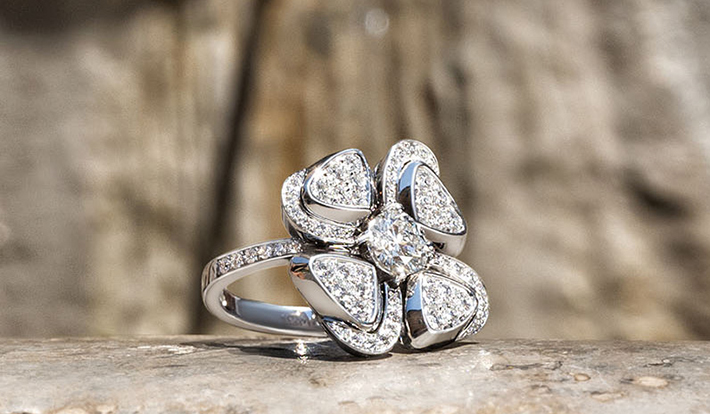 大胆なラインとダイヤモンドで独自に作り上げられた新アイコンは、女性を輝かしく賛美するものだ。花の中心にあしらわれたダイヤモンドの周りに、立体的に描かれた花びらを配したデザインにブルガリ特有のボリューム感のあるスタイルが見て取れる。