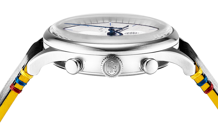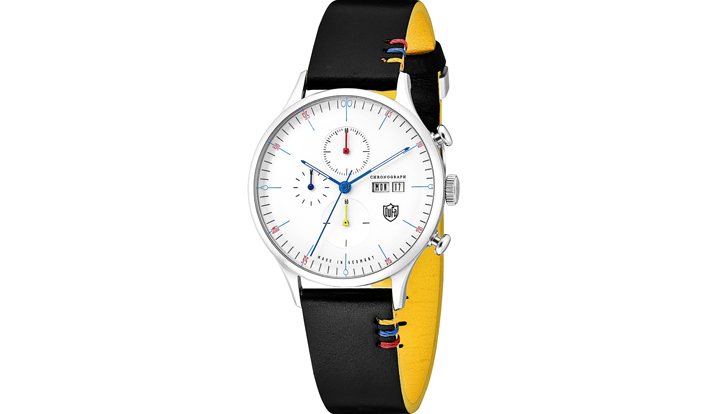 シンプルなウォッチに、 バウハウスが提唱した”基本形状”や“三原色”を主張を抑えながらデザイン
