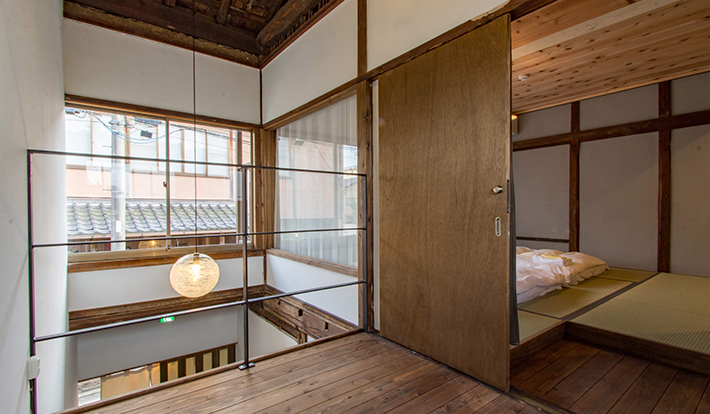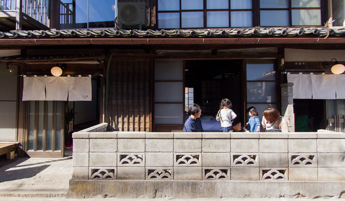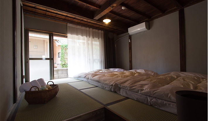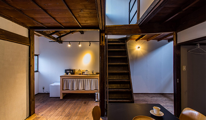 施設の特徴は、フロントや食事処といった、旅館やホテルでは当たり前にあるはずの機能を持たせていない点。チェックインは近くの洋品店、食事は街中の飲食店といったように、まちをひとつの宿と見立て、宿泊施設と地域の日常をネットワークさせ、まちぐるみで宿泊客をもてなす「まちやど」方式を採用している。