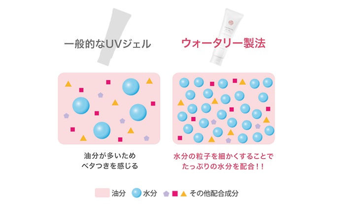 独自の「ウォータリー製法」により、ジェルに含まれる水分の粒子を細かくすることでたっぷりの水分を配合しており、みずみずしいのに皮膜感やベタつきの気にならないつけ心地を実現している。