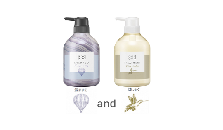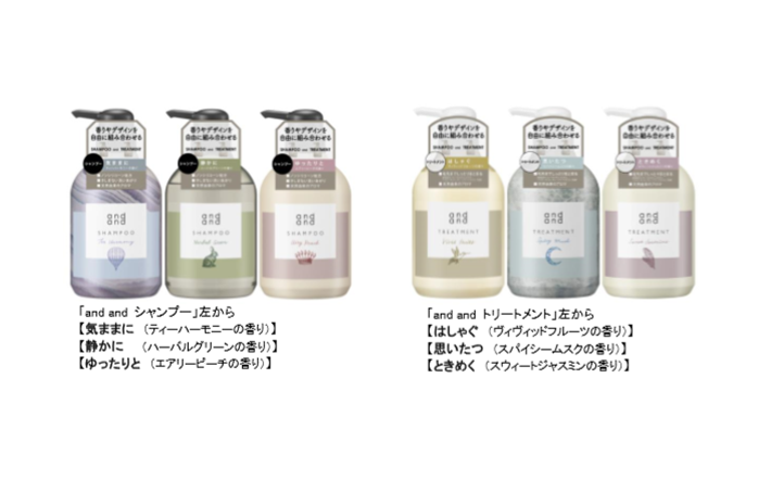 新ヘアケアブランド「and and」は、その日の気分によってお気に入りの香りやパケージでシャンプーとトリートメントの組み合わせを楽しむことができる。シャンプーとトリートメント、それぞれの場面で感じる快適な気分を、感性科学に基づいて分析。厳選された天然由来のアロマを使用して、それぞれの場面での“快適な気分を感じる香り”を各3種、新規に調合している。