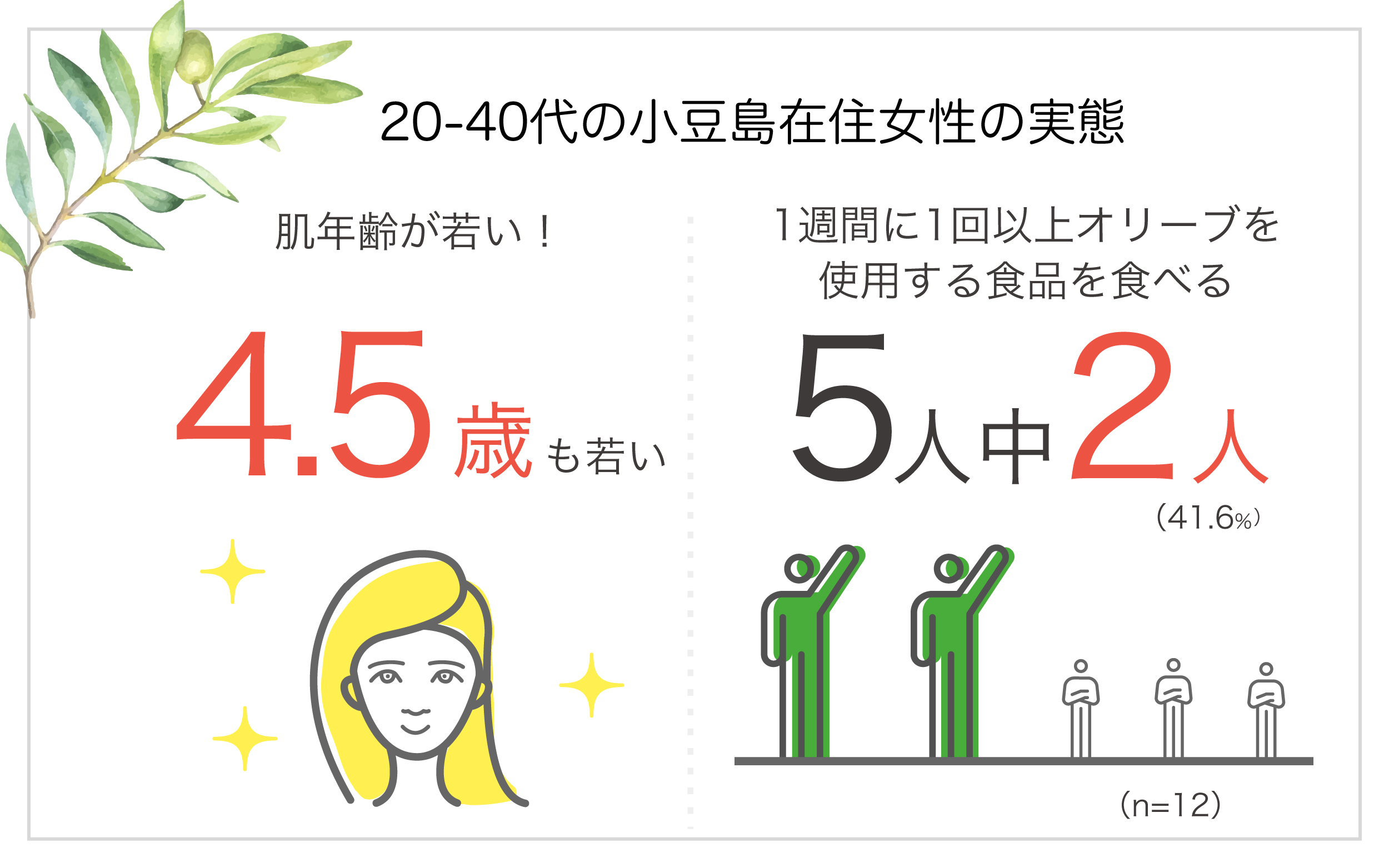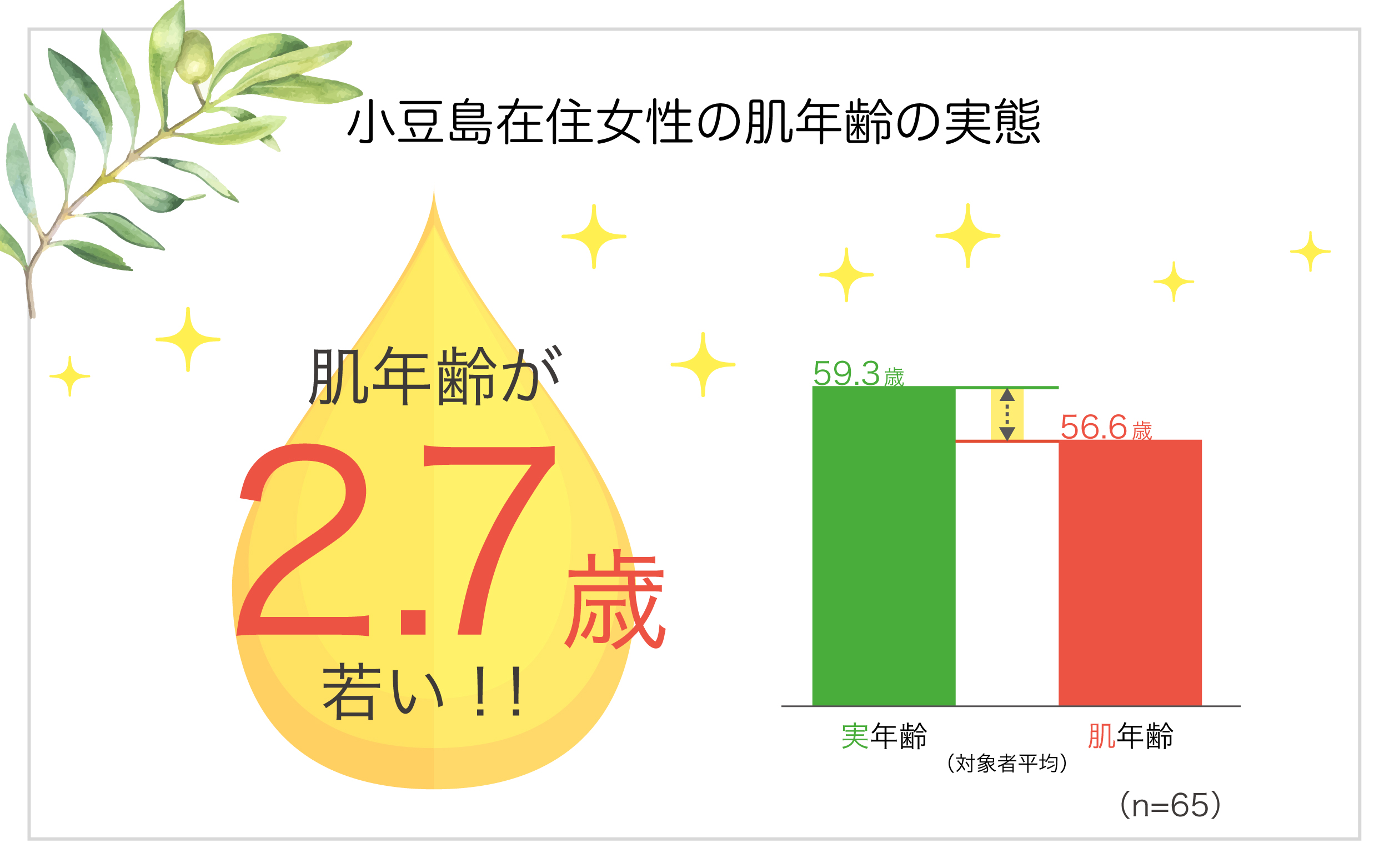 さらに、クラシエホームプロダクツが小豆島に住む20~80代の女性65人を対象に行った調査では小豆島在住の女性は肌年齢が実年齢に対して平均2.6歳若く、特にオリーブの実やオリーブティーなど、オリーブを使用した食品を食べている頻度が50代~80代に比べ多かった20代~40代では、平均-4.5歳と、とりわけ若いことがわかった。調査では「オリーブを唇に塗って、蒸しタオルでパックする (60代/小豆島在住30~40年未満)、「オリーブオイルのホットパック」(30代/小豆島在住30~40年未満)などオリーブ名産地ならではのスキンケア方法も明らかになった。