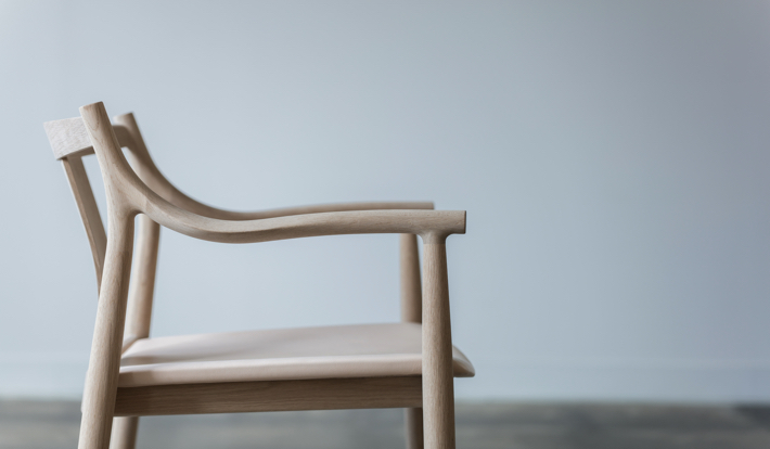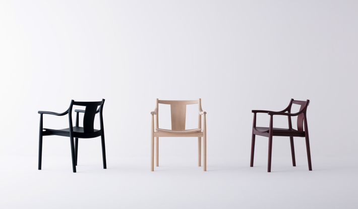 身体感覚から導き出したというチェアは、 彫刻的な佇まいを有している。この有機的なフォルムは、曲げ木技術をはじめとする日進木工の職人たちの卓越した技があってこそ実現できたといえよう。北欧や中国の明調、シェーカーチェアなど、さまざまな椅子のデザインの要素を再構築したことで、多様な空間と重なり合う。