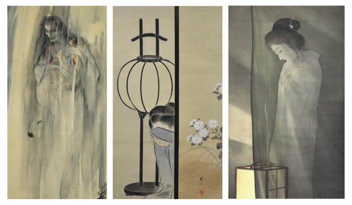左から、伊藤晴雨「怪談乳房榎図」、池田綾岡「皿屋敷」、鰭崎英朋「蚊帳の前の幽霊」。